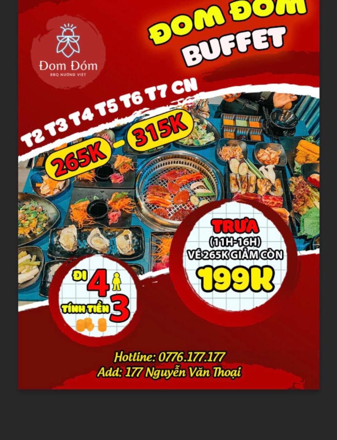Call ngay 0776 177 177 hoặc nhắn tin cho chúng mình để đặt bàn bây giờ: m.me/domdombbqnuongvietTháng mới khai đũa, Đom Đóm “restart” ưu đãi 1 SUẤT BUFFET 0Đ cho nhóm 4 rồi đây homies ơiiiii