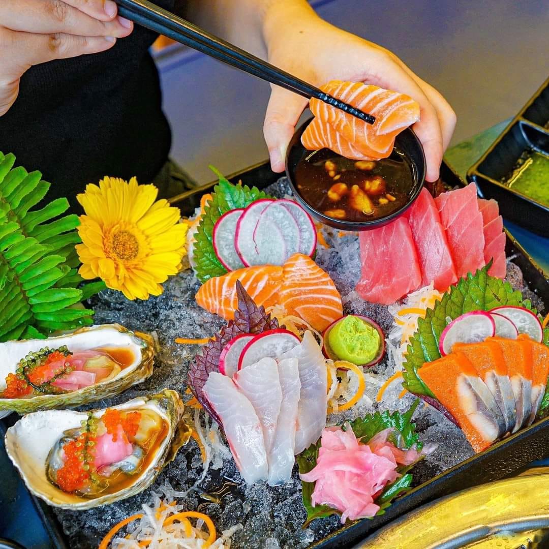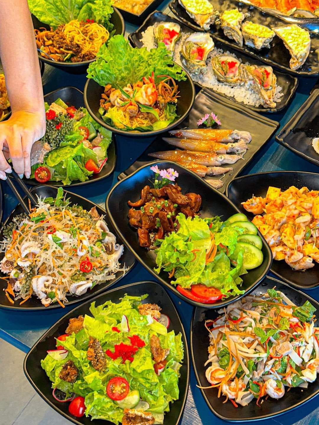Bàn tiệc Buffet đa dạng với 80+ món khai vị và món chính: món nướng, lẩu, món chiên, món gỏi, sashimi, hải sản…