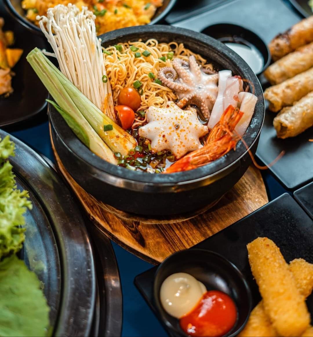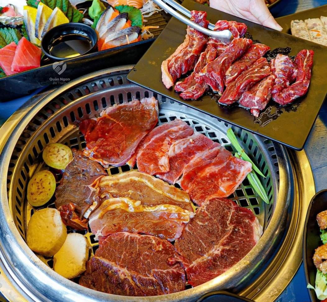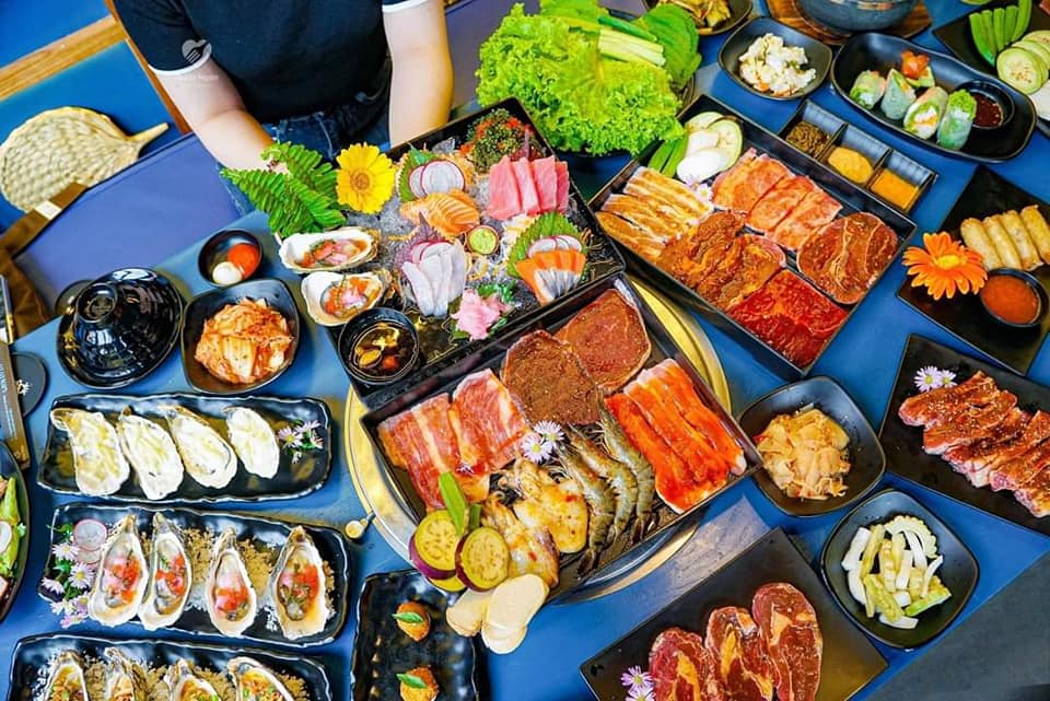 Bàn tiệc Buffet đa dạng với 80+ món khai vị và món chính: món nướng, lẩu, món chiên, món gỏi, sashimi, hải sản… Món nướng phủ phê cùng thịt tươi thượng hạng, mọng nước: Ba chỉ bò Mỹ, Dẻ sườn bò, Gàu bò, Nạc cổ, Lõi vai bò,….gi gỉ gì gi thịt gì cũng có